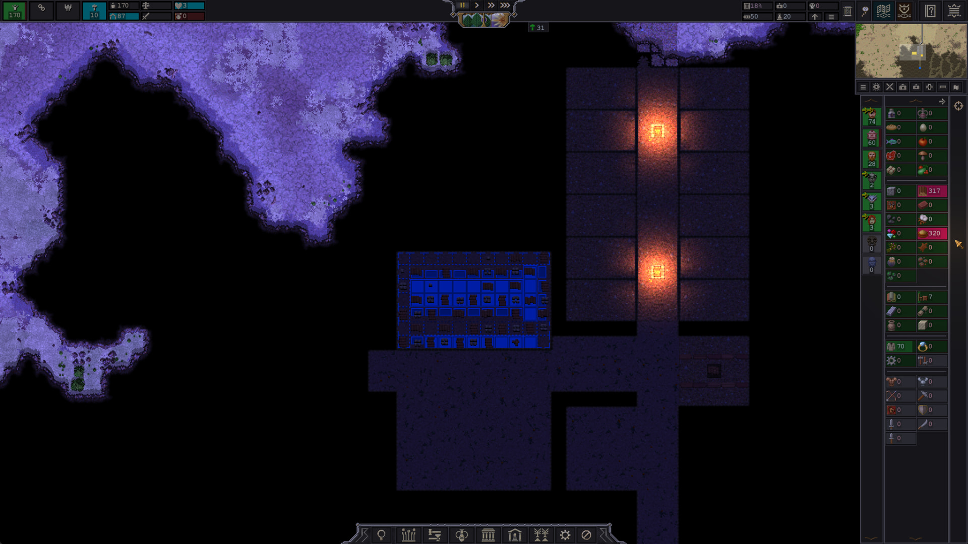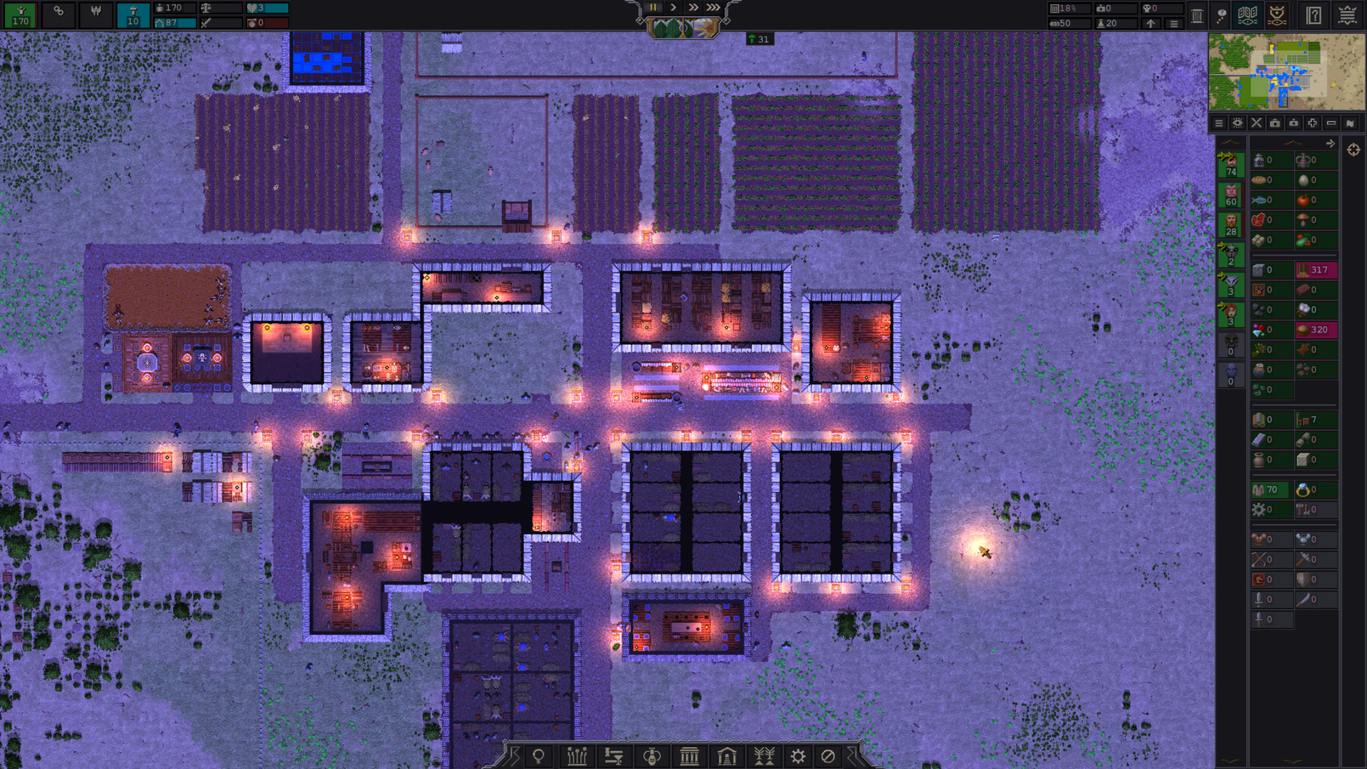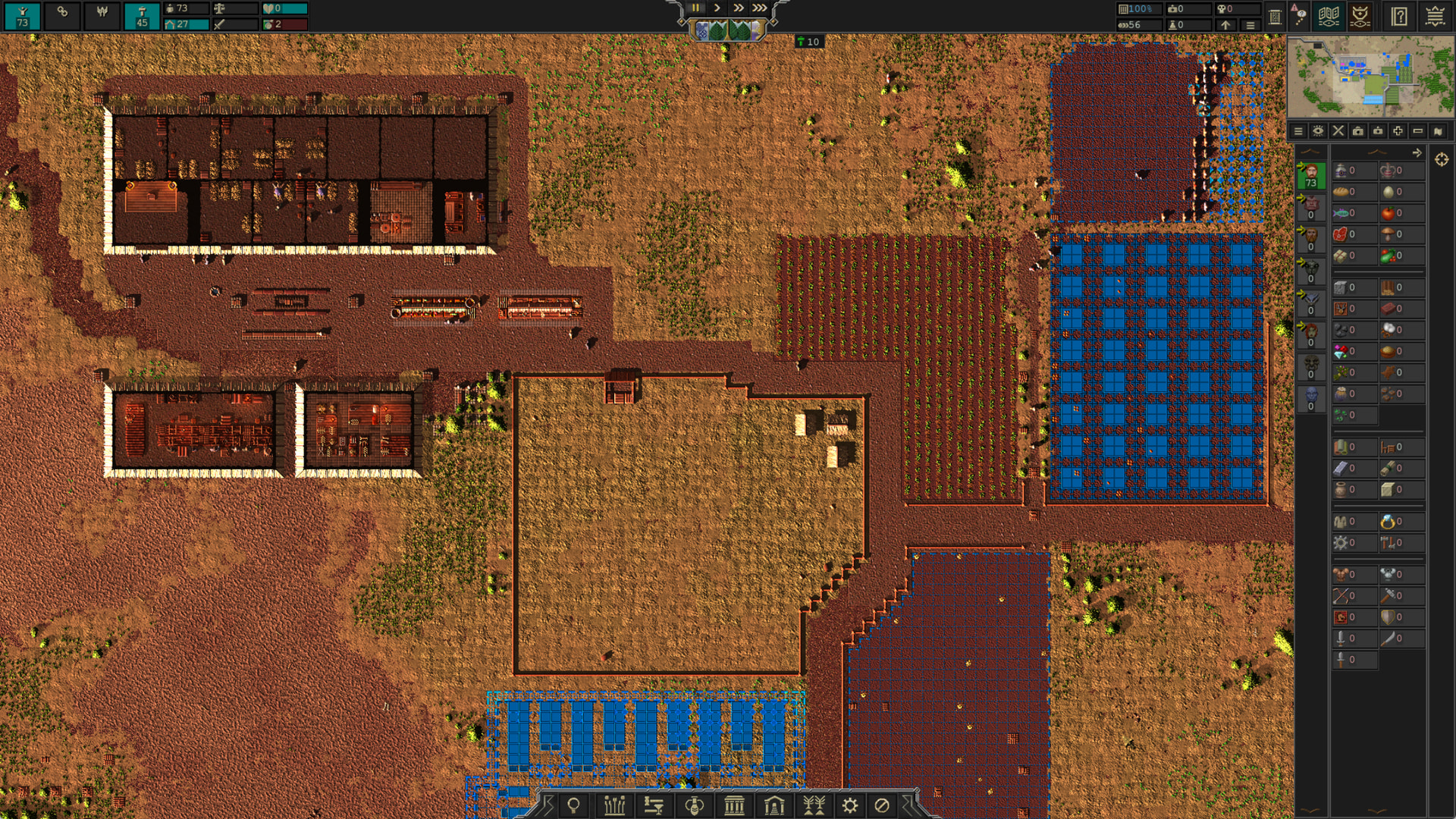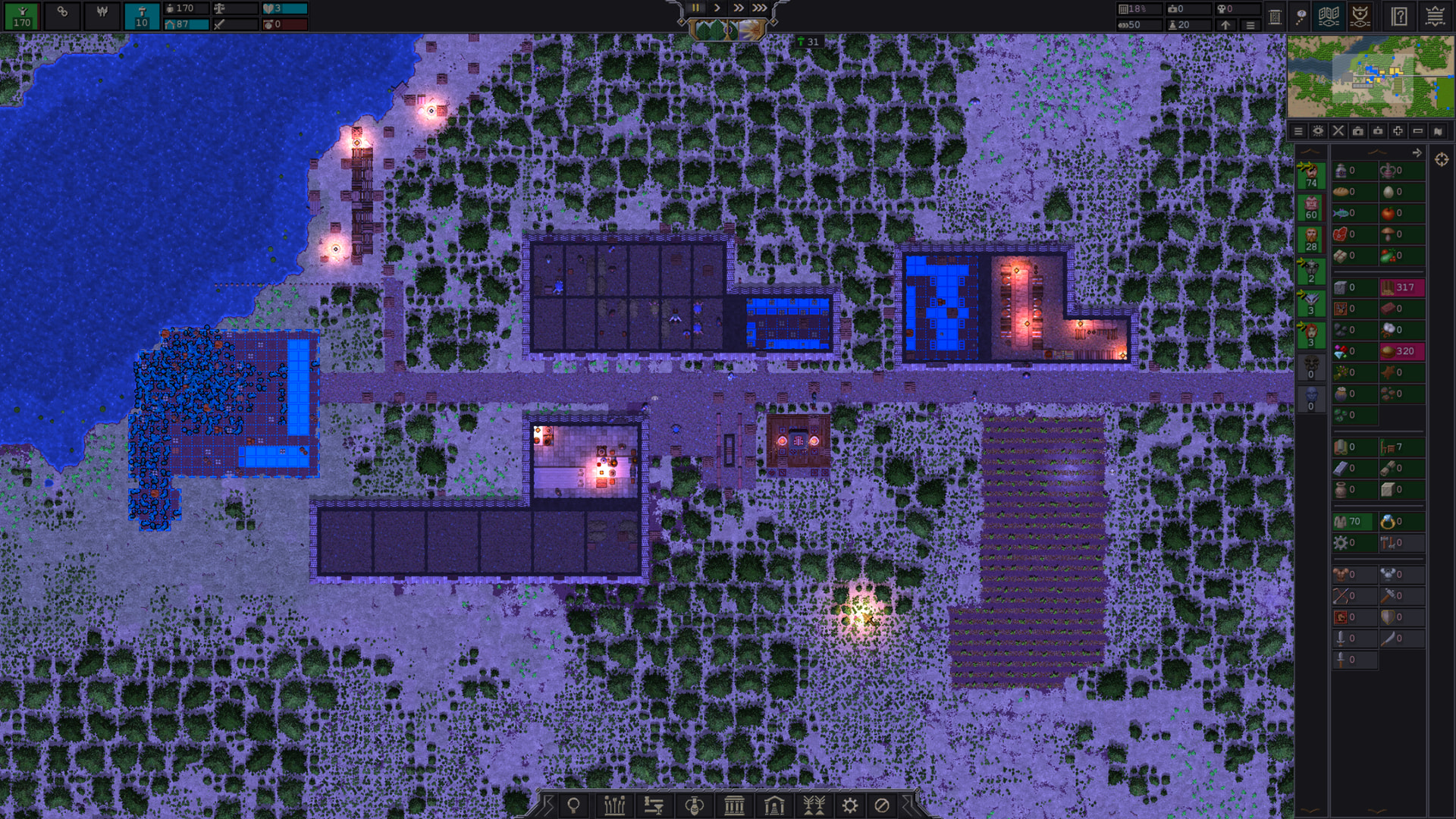 I started a new game last night on Stream, Songs of Syx! Was fun, like Rimworld but with control over hundreds to thousands of pawns instead of just a couple. I figured I’d take some screenshots of the Colony as I left it at the end of Stream.